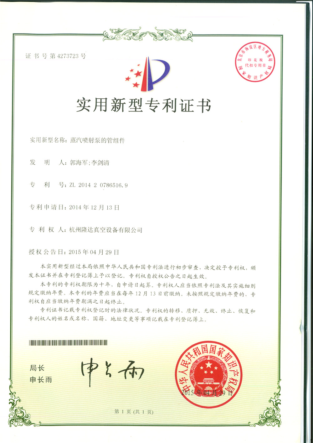 Patent certificate